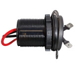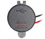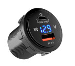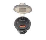 Tupla USB-laturi jännitenäytöllä. Voidaan uppoasentaa 29 mm aukkoon, toimii sekä 12 että 24 voltin järjestelmissä.