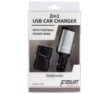 USB-autolaturi joka sisältää myös 2600mAh varavirtalähteen.